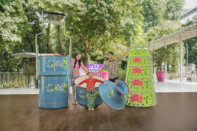 在 Siloso Point 火车站,您可以通过两个高耸入云的 Tiffin Carrier 装置发现峇里那堪文化,这两个装置的灵感来自于 Intan 的收藏品。其中一个以巨大的娘惹粿条为特色:Kueh Ku、Kueh Lapis 和 Kueh Salat。周末,您可以参加泥粿制作和刺绣等轮流举办的工作坊,亲身体验娘惹文化。
