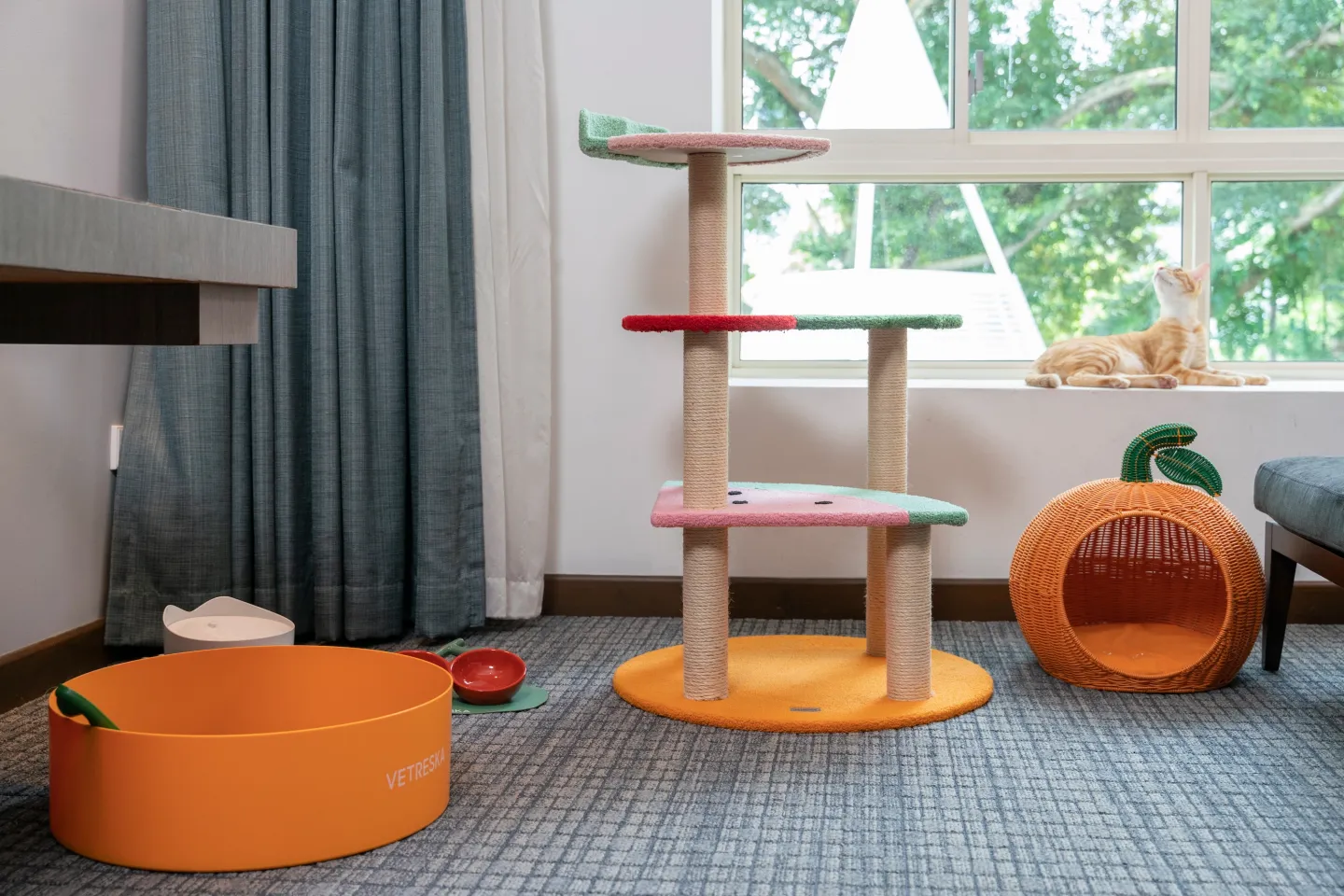 为爱猫打造专属度假体验,升级版"宠爱喵喵房"套餐包含:温馨住宿空间,配备VETRESKA品牌趣味实用猫家具;精选人类食品级原料烹制的精致餐食;以及新加坡最大线上宠物店Kohepets特别定制的毛孩礼盒。